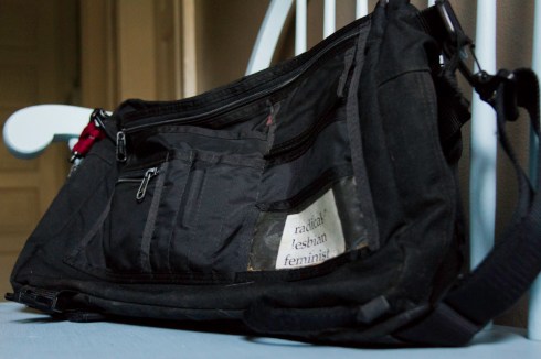 And whenever I open up the bag, I’m greeted by the “radical lesbian feminist” sticker placed in the clear corner pocket. (I think that dates back to a college boyfriend if memory serves correct.)
