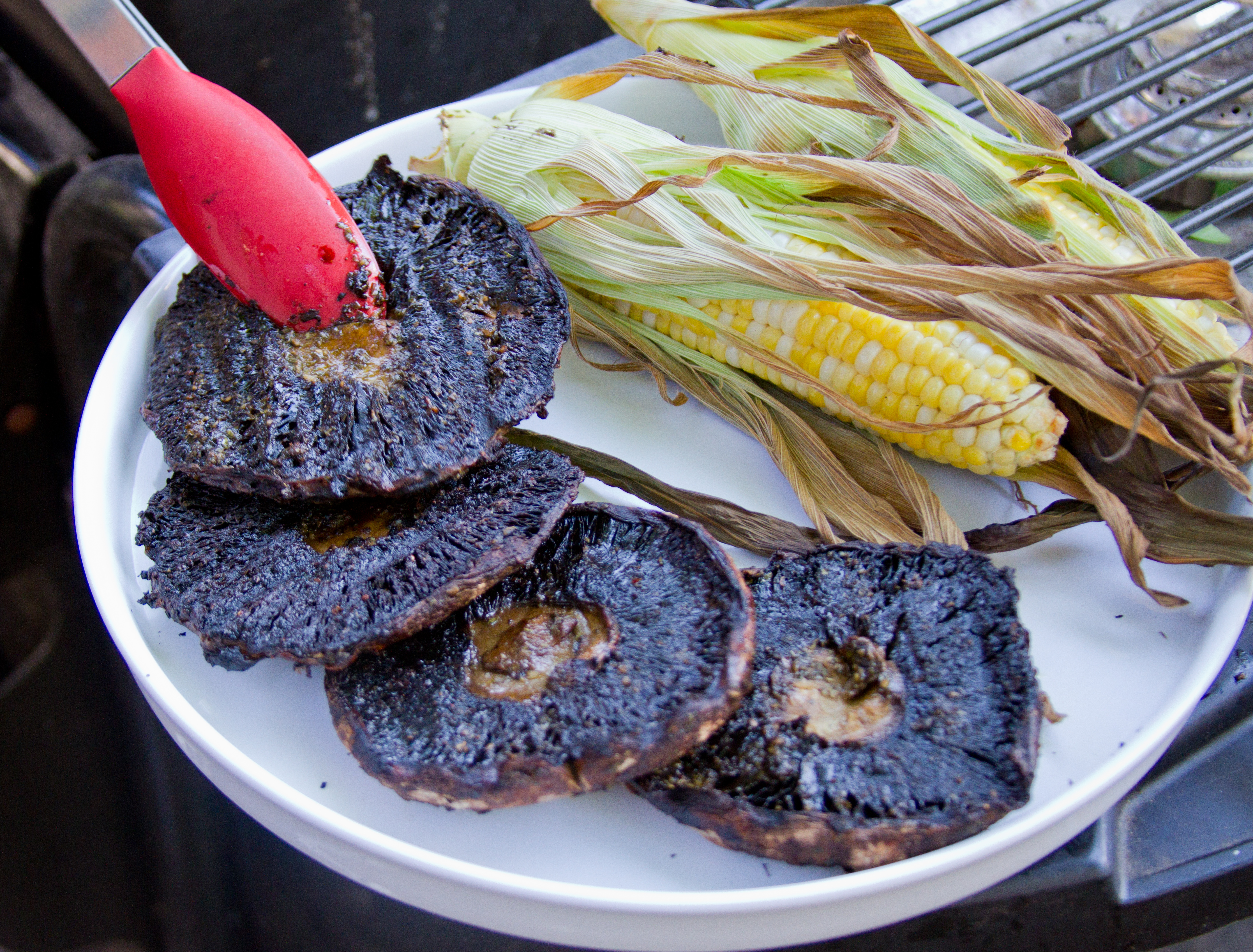 Cook corn on the cob on upper rack of grill for same length of time as portabella mushrooms.
