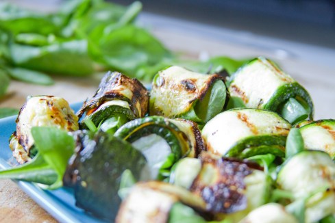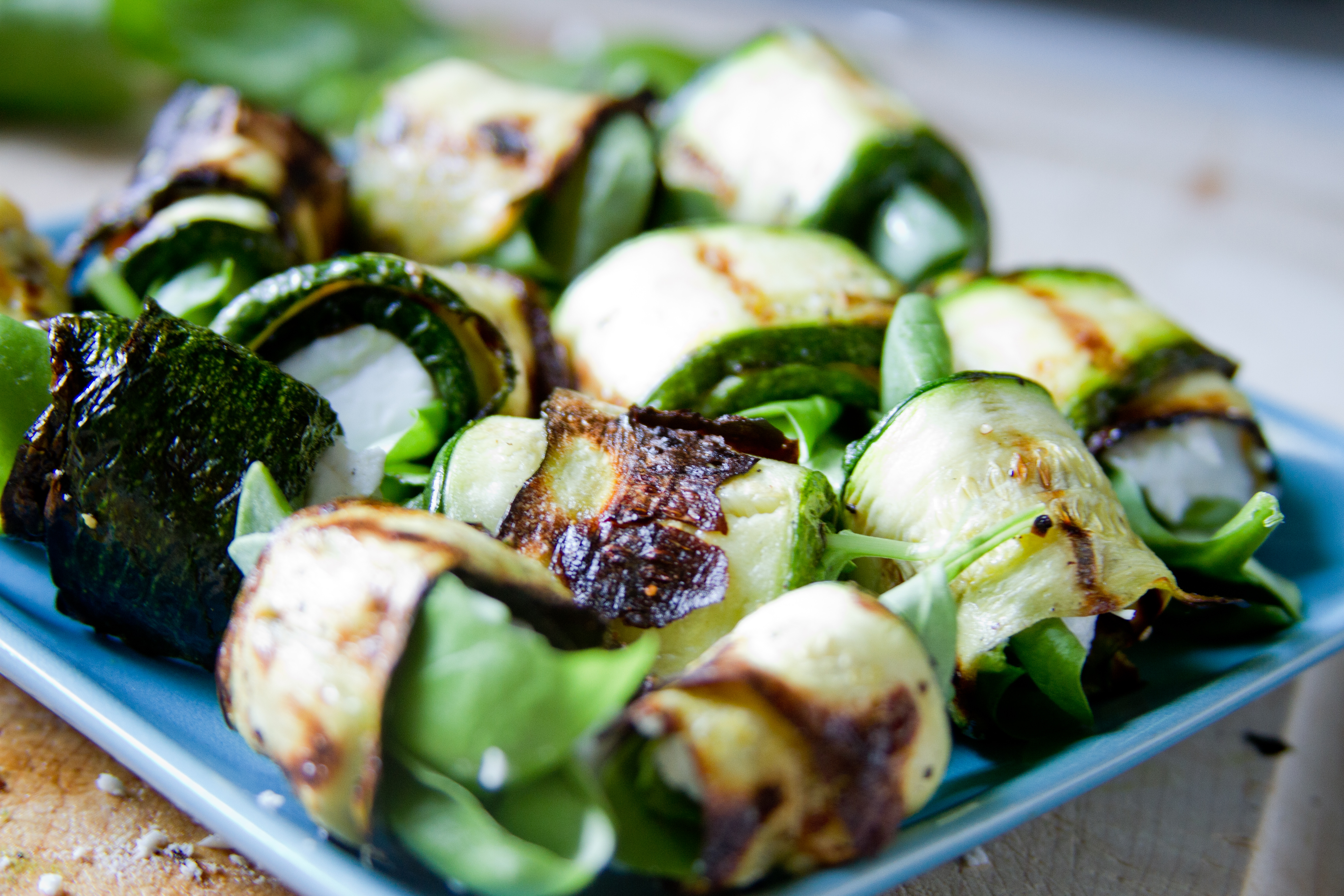 Put the fresh farmer’s goat cheese, baby spinach and basil together and roll into the grilled zucchini. (I usually use a goat cheese rolled in herbs for the filling, adds even more flavor!)