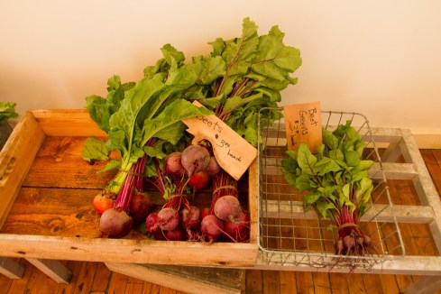 Bunches of veggies wrapped in twine and placed in wood crates and wire baskets. Labeled with scrap pieces of wood and priced by hand with perfect font in black marker. (I love nicely fonted things, as also discussed here.)
