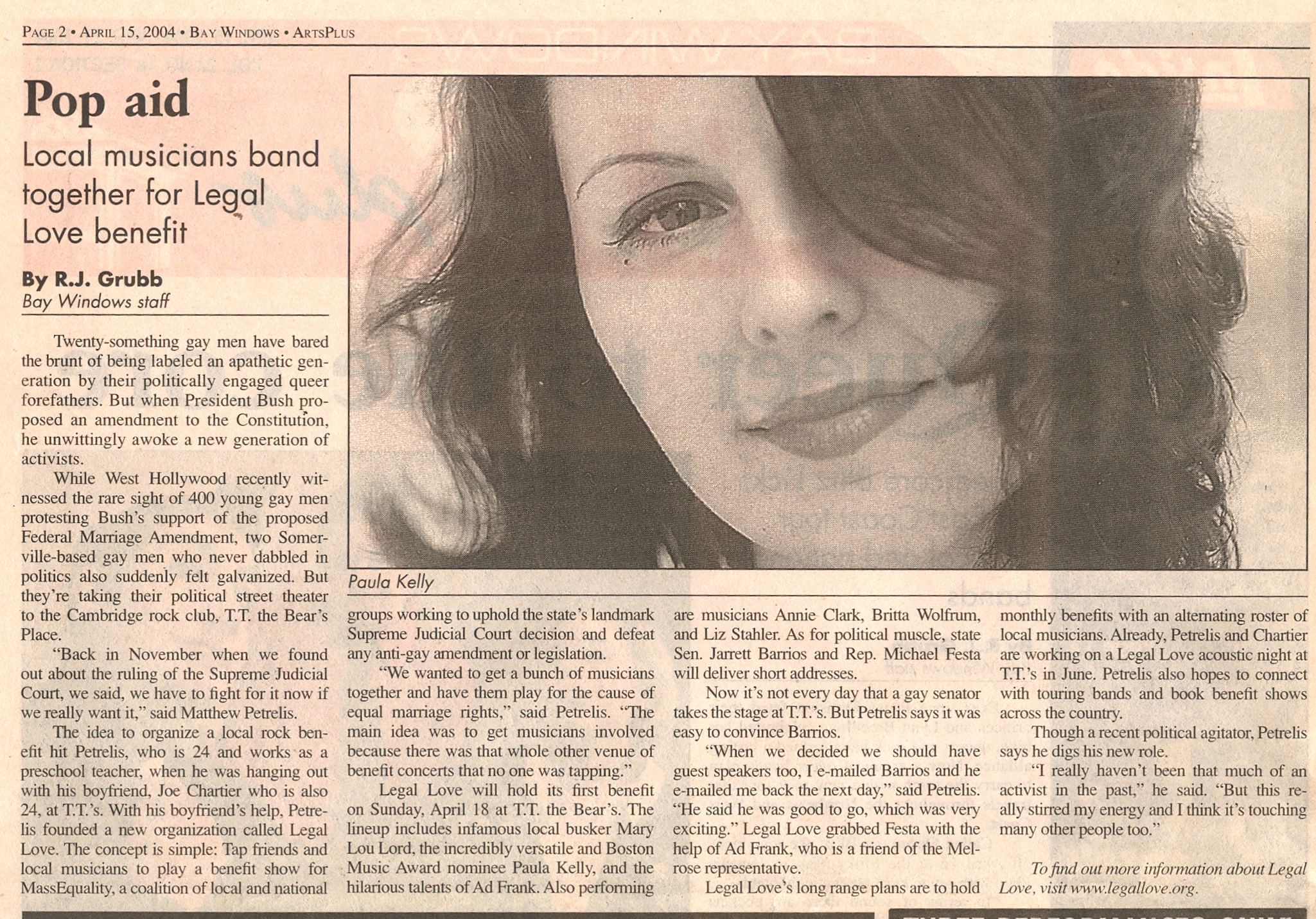 We decided to put on benefit shows in support of gay marriage. The Boston music community took to it with open arms. We held several shows over a time span of a year or two. We had great success and were able to raise thousands of dollars for the cause of protecting equal marriage rights in Massachusetts. We couldn’t have done it without the artists who volunteered their time and talents to the cause.