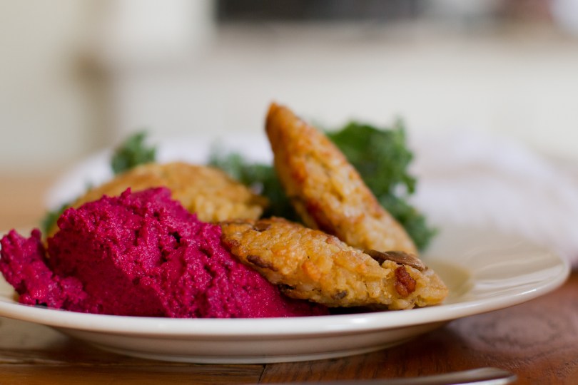 Cheesy Mushroom Risotto Fritters with Beet Hummus.